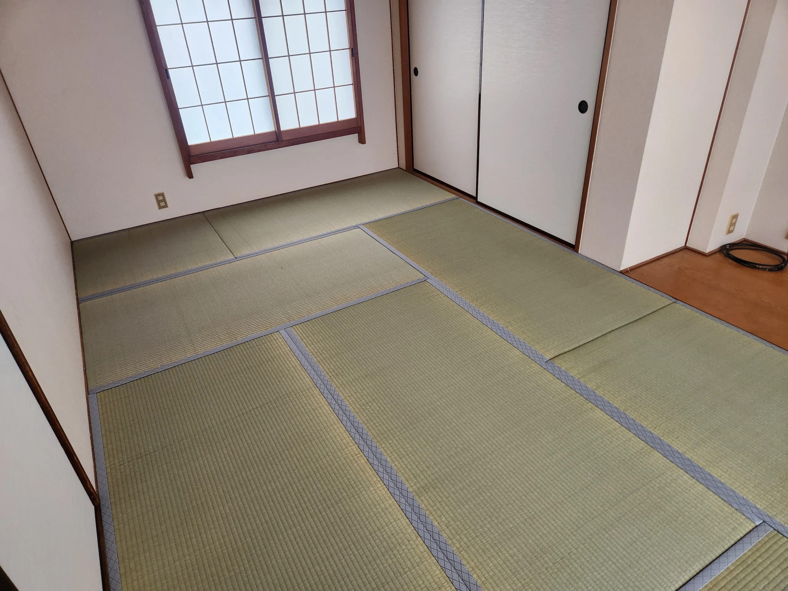 今回はご予算優先で中国産の畳表ですが、目地(畳と畳の境目)を真っ直ぐにそろえ、**目違い(高さズレ)**が出ないよう調整して、パッと見の質感を上げています。